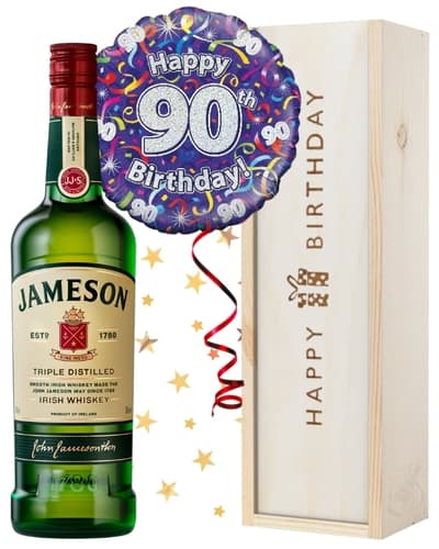 Make someone’s 90th birthday classic and sophisticated with this Irish Whiskey gift set. Surprise a loved one or friend with a single bottle of Jameson Irish Whiskey to enjoy on their special day. It’s stylishly presented in one of our wooden gift boxes with ‘Happy Birthday’ printed on the lid and wood wool lining for protection and safe delivery. It also comes with a fully-inflated helium 90th birthday balloon and a personalised message to make this gift like no other. You can send it anywhere in the UK with next day or selected date delivery. It’s the perfect birthday gift for anyone who loves Irish Whiskey!