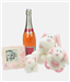 A luxury wicker hamper complete with leather straps and handle. Contents includes House Champagne - Bourgeois-Diaz Rose(75cl) and baby gifts to include  Picture Frame, Cuddly Dog, Dog Rattle and Dog Squeaker/Teether.