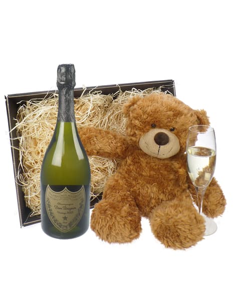 A single bottle of Dom Perignon Vintage Champagne together with a fantastic cuddly loveable soft bear. Supplied in a gift basket you can personalize this gift by adding your own personal message. The current Vintage is 2009.