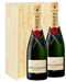 A gorgeous gift box that contains two incredible bottles of champagne to enjoy, not only is this lovely present presented to the recipient in a chic wooden box, it also contains everything needed to deliciously celebrate any personal event in their lives. Designed for easy personalization if desired, this wonderful set can include a custom card with a personal message from you along with it as well. A gift box containing two tasty bottles of Moet & Chandon Brut Imperial Champagne within it; this is a duo that is sure to have any recipient fully satisfied by the end of every glass.