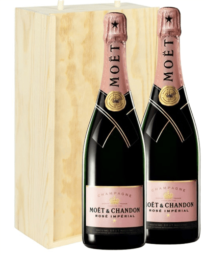 A single bottle of Moet NV Rose & a single bottle of Moet Rose Vintage Champagne. This is presented in a wooden gift box and you can personalize this gift by adding your own personal message.