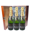 Three bottles of Moet & Chandon Vintage Champagne. Presented in a luxurious stained wooden box with traditional joins and hinged lid with clasp. The inside of the boxed is lined with blue silk and you can personalize this gift by adding your own personal message.