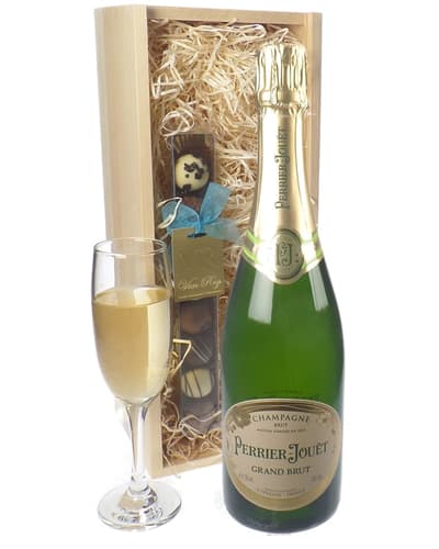 Send someone this great gift of a single bottle of the lovely Perrier Jouet Champagne together with a delicious box of assorted chocolate truffles (110g). The gift is sent out in one of our wooden gift boxes with the chocolates packed along side the Champagne to ensure the wow factor.