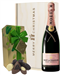Whether for a friend, colleague or family member, there’s no Christmas gift more delicious and sophisticated than this one! Treat someone to a single bottle of Moet & Chandon Rose Brut Champagne along with a box of assorted Belgian chocolates. Beautifully paired and carefully packaged, this gift is presented in one of our wooden gift boxes with ‘Merry Christmas’ printed on the lid and wood wool lining. So why not spread festive cheer and send a package today? You can have this gift delivered anywhere in the UK, with next day or selected date delivery. Plus, personalise this gift with a printed gift message and make this Christmas the best one yet!
