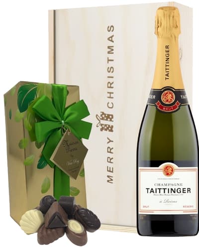 Get the Christmas festivities flowing by sending someone this gorgeous and truly delicious Champagne and chocolate gift set. Be your own Father Christmas and surprise someone with a festive present! Send them a single bottle of the famous Taittinger Champagne with a box of assorted Belgian chocolate truffles to enjoy on Christmas Day. Beautifully paired, this gift is presented in one of our festive wooden gift boxes with ‘Merry Christmas’ printed on the lid and wood wool lining for style and protection. You can also add your own personalised to wish the recipient a Happy Christmas! Have it delivered straight to their door with ether next day or selected date delivery.