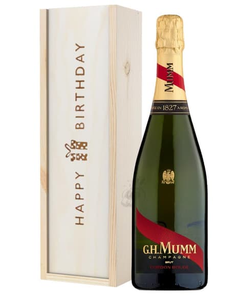 A single bottle of Mumm Cordon Rouge Champagne. This is presented in our 'Happy Birthday' branded wooden gift box and is lined with wood wool. Personalize this gift by adding your own personal message.