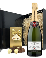 Indulge in luxury with this elegant Personalised Champagne & Chocolate Gift Set. Featuring a 75cl bottle of Paul Langier Brut NV Champagne paired with a delectable 125g selection of Belgian chocolates, it’s beautifully presented in a sleek black hamper box—perfect for birthdays, anniversaries, weddings or any special celebration.
