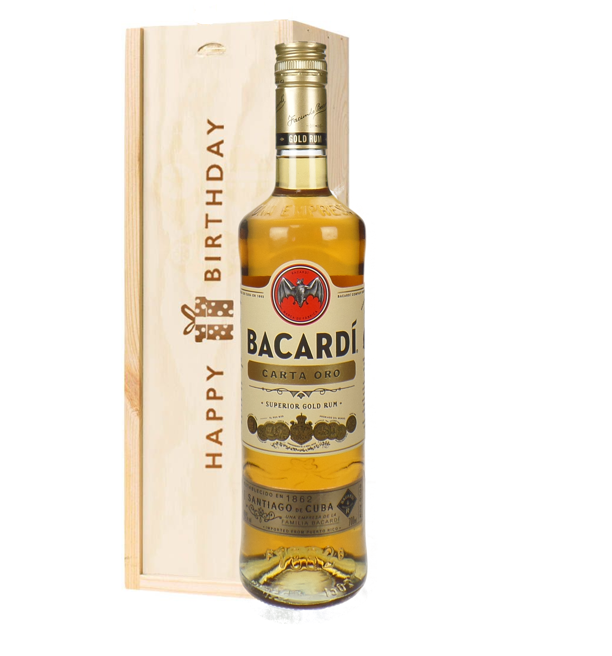 Bacardi Carta Oro is Bacardi's Gold rum. Its classed as a superior rum and is produced in Puerto Rico. It is made from over 14 different rums which have been aged from 3 - 5 years and then blended together.We present this in our 'Happy Birthday' branded wooden gift box. You can also add a personal gift card message to the gift.