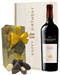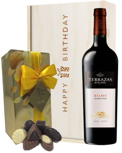 A bottle of Malbec wine from Argentina together with a box of assorted Belgian chocolates (250g approx 20 chocolates) and presented in a Happy Birthday design wooden gift box.