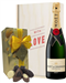 What’s more romantic than Champagne and chocolate? Give your Valentine a gift they’ll never forget with this indulgent pairing. Surprise them with a single bottle of Moet & Chandon Imperial Brut Champagne along with a box of assorted Belgian chocolates. Ideal for any Valentine’s Day celebrations, both are presented in one of our wooden gift boxes with ‘With Love’ printed on the lid and wood wool lining for style and protection. You can personalise this gift with a written message printed onto a gift card. Plus, send this gift anywhere in the UK for the most romantic surprise! Next day or selected date delivery is available, making this the ultimate Valentine’s Day gift set.